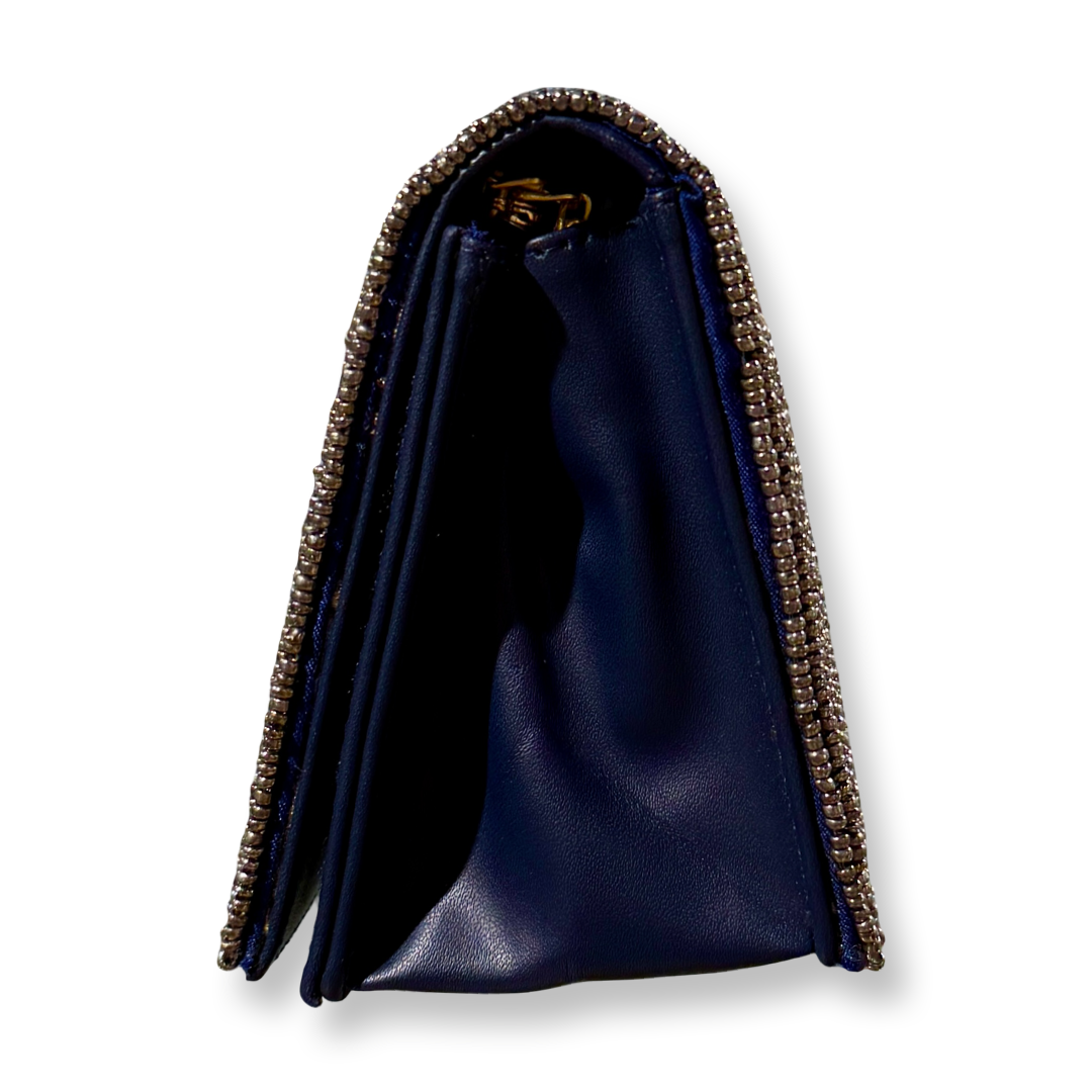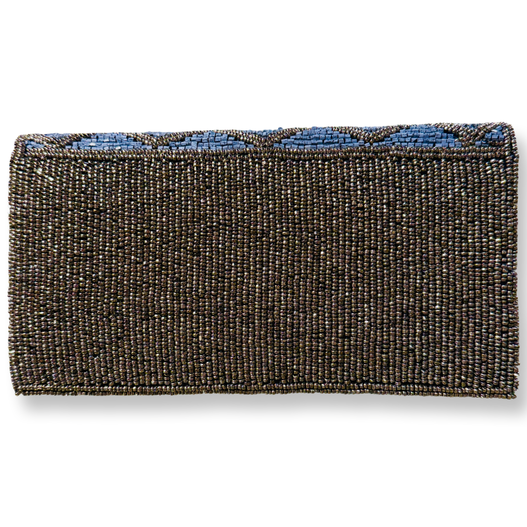 Elegant and refined with a touch of shimmer, this stunning clutch is a timeless accessory for any special occasion. Handcrafted with intricate blue and pewter beadwork, the front showcases a beautifully detailed design that catches the light with every movement.